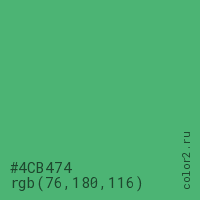 Цвет #4CB474 в цветовой модели RGB обозначается тремя октетами (76, 180, 116) в десятичном формате и #4CB474 в шестнадцатиричном (hex) формате, которые являются интенсивностью красного 76 (hex 4C), интенсивность зелёного 180 (hex B4) и интенсивность синего 116 (hex 74).