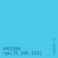 Цвет #4CC8EB в цветовой модели RGB обозначается тремя октетами (76, 200, 235) в десятичном формате и #4CC8EB в шестнадцатиричном (hex) формате, которые являются интенсивностью красного 76 (hex 4C), интенсивность зелёного 200 (hex C8) и интенсивность синего 235 (hex EB).
