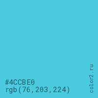 Цвет #4CCBE0 в цветовой модели RGB обозначается тремя октетами (76, 203, 224) в десятичном формате и #4CCBE0 в шестнадцатиричном (hex) формате, которые являются интенсивностью красного 76 (hex 4C), интенсивность зелёного 203 (hex CB) и интенсивность синего 224 (hex E0).