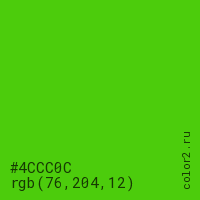 Цвет #4CCC0C в цветовой модели RGB обозначается тремя октетами (76, 204, 12) в десятичном формате и #4CCC0C в шестнадцатиричном (hex) формате, которые являются интенсивностью красного 76 (hex 4C), интенсивность зелёного 204 (hex CC) и интенсивность синего 12 (hex 0C).