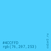 Цвет #4CCFFD в цветовой модели RGB обозначается тремя октетами (76, 207, 253) в десятичном формате и #4CCFFD в шестнадцатиричном (hex) формате, которые являются интенсивностью красного 76 (hex 4C), интенсивность зелёного 207 (hex CF) и интенсивность синего 253 (hex FD).