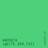 Цвет #4CD07A в цветовой модели RGB обозначается тремя октетами (76, 208, 122) в десятичном формате и #4CD07A в шестнадцатиричном (hex) формате, которые являются интенсивностью красного 76 (hex 4C), интенсивность зелёного 208 (hex D0) и интенсивность синего 122 (hex 7A).
