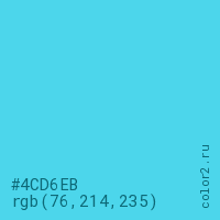 Цвет #4CD6EB в цветовой модели RGB обозначается тремя октетами (76, 214, 235) в десятичном формате и #4CD6EB в шестнадцатиричном (hex) формате, которые являются интенсивностью красного 76 (hex 4C), интенсивность зелёного 214 (hex D6) и интенсивность синего 235 (hex EB).