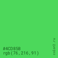 Цвет #4CD85B в цветовой модели RGB обозначается тремя октетами (76, 216, 91) в десятичном формате и #4CD85B в шестнадцатиричном (hex) формате, которые являются интенсивностью красного 76 (hex 4C), интенсивность зелёного 216 (hex D8) и интенсивность синего 91 (hex 5B).