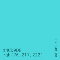 Цвет #4CD9DE в цветовой модели RGB обозначается тремя октетами (76, 217, 222) в десятичном формате и #4CD9DE в шестнадцатиричном (hex) формате, которые являются интенсивностью красного 76 (hex 4C), интенсивность зелёного 217 (hex D9) и интенсивность синего 222 (hex DE).