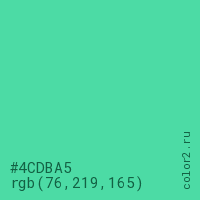 Цвет #4CDBA5 в цветовой модели RGB обозначается тремя октетами (76, 219, 165) в десятичном формате и #4CDBA5 в шестнадцатиричном (hex) формате, которые являются интенсивностью красного 76 (hex 4C), интенсивность зелёного 219 (hex DB) и интенсивность синего 165 (hex A5).