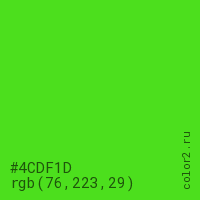 Цвет #4CDF1D в цветовой модели RGB обозначается тремя октетами (76, 223, 29) в десятичном формате и #4CDF1D в шестнадцатиричном (hex) формате, которые являются интенсивностью красного 76 (hex 4C), интенсивность зелёного 223 (hex DF) и интенсивность синего 29 (hex 1D).