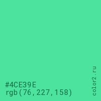 Цвет #4CE39E в цветовой модели RGB обозначается тремя октетами (76, 227, 158) в десятичном формате и #4CE39E в шестнадцатиричном (hex) формате, которые являются интенсивностью красного 76 (hex 4C), интенсивность зелёного 227 (hex E3) и интенсивность синего 158 (hex 9E).