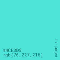 Цвет #4CE3D8 в цветовой модели RGB обозначается тремя октетами (76, 227, 216) в десятичном формате и #4CE3D8 в шестнадцатиричном (hex) формате, которые являются интенсивностью красного 76 (hex 4C), интенсивность зелёного 227 (hex E3) и интенсивность синего 216 (hex D8).