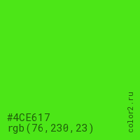 Цвет #4CE617 в цветовой модели RGB обозначается тремя октетами (76, 230, 23) в десятичном формате и #4CE617 в шестнадцатиричном (hex) формате, которые являются интенсивностью красного 76 (hex 4C), интенсивность зелёного 230 (hex E6) и интенсивность синего 23 (hex 17).
