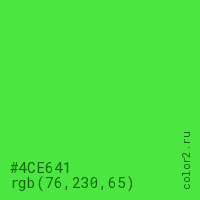 Цвет #4CE641 в цветовой модели RGB обозначается тремя октетами (76, 230, 65) в десятичном формате и #4CE641 в шестнадцатиричном (hex) формате, которые являются интенсивностью красного 76 (hex 4C), интенсивность зелёного 230 (hex E6) и интенсивность синего 65 (hex 41).