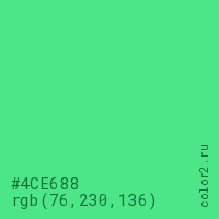 Цвет #4CE688 в цветовой модели RGB обозначается тремя октетами (76, 230, 136) в десятичном формате и #4CE688 в шестнадцатиричном (hex) формате, которые являются интенсивностью красного 76 (hex 4C), интенсивность зелёного 230 (hex E6) и интенсивность синего 136 (hex 88).
