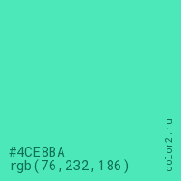 Цвет #4CE8BA в цветовой модели RGB обозначается тремя октетами (76, 232, 186) в десятичном формате и #4CE8BA в шестнадцатиричном (hex) формате, которые являются интенсивностью красного 76 (hex 4C), интенсивность зелёного 232 (hex E8) и интенсивность синего 186 (hex BA).
