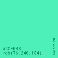 Цвет #4CF0B8 в цветовой модели RGB обозначается тремя октетами (76, 240, 184) в десятичном формате и #4CF0B8 в шестнадцатиричном (hex) формате, которые являются интенсивностью красного 76 (hex 4C), интенсивность зелёного 240 (hex F0) и интенсивность синего 184 (hex B8).