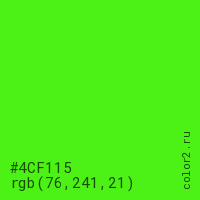 Цвет #4CF115 в цветовой модели RGB обозначается тремя октетами (76, 241, 21) в десятичном формате и #4CF115 в шестнадцатиричном (hex) формате, которые являются интенсивностью красного 76 (hex 4C), интенсивность зелёного 241 (hex F1) и интенсивность синего 21 (hex 15).