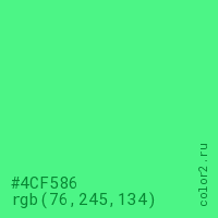Цвет #4CF586 в цветовой модели RGB обозначается тремя октетами (76, 245, 134) в десятичном формате и #4CF586 в шестнадцатиричном (hex) формате, которые являются интенсивностью красного 76 (hex 4C), интенсивность зелёного 245 (hex F5) и интенсивность синего 134 (hex 86).