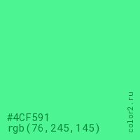Цвет #4CF591 в цветовой модели RGB обозначается тремя октетами (76, 245, 145) в десятичном формате и #4CF591 в шестнадцатиричном (hex) формате, которые являются интенсивностью красного 76 (hex 4C), интенсивность зелёного 245 (hex F5) и интенсивность синего 145 (hex 91).
