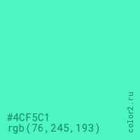 Цвет #4CF5C1 в цветовой модели RGB обозначается тремя октетами (76, 245, 193) в десятичном формате и #4CF5C1 в шестнадцатиричном (hex) формате, которые являются интенсивностью красного 76 (hex 4C), интенсивность зелёного 245 (hex F5) и интенсивность синего 193 (hex C1).