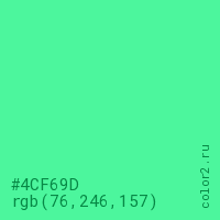 Цвет #4CF69D в цветовой модели RGB обозначается тремя октетами (76, 246, 157) в десятичном формате и #4CF69D в шестнадцатиричном (hex) формате, которые являются интенсивностью красного 76 (hex 4C), интенсивность зелёного 246 (hex F6) и интенсивность синего 157 (hex 9D).
