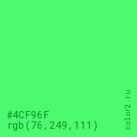 Цвет RGB(76, 249, 111) в процентом отношении количества цвета состоит из 29.8% красного (red), 97.6% зелёного (green) и 43.5% синего (blue).