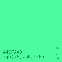 Цвет #4CFAA0 в цветовой модели RGB обозначается тремя октетами (76, 250, 160) в десятичном формате и #4CFAA0 в шестнадцатиричном (hex) формате, которые являются интенсивностью красного 76 (hex 4C), интенсивность зелёного 250 (hex FA) и интенсивность синего 160 (hex A0).