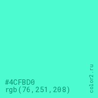 Цвет #4CFBD0 в цветовой модели RGB обозначается тремя октетами (76, 251, 208) в десятичном формате и #4CFBD0 в шестнадцатиричном (hex) формате, которые являются интенсивностью красного 76 (hex 4C), интенсивность зелёного 251 (hex FB) и интенсивность синего 208 (hex D0).