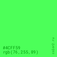 Цвет #4CFF59 в цветовой модели RGB обозначается тремя октетами (76, 255, 89) в десятичном формате и #4CFF59 в шестнадцатиричном (hex) формате, которые являются интенсивностью красного 76 (hex 4C), интенсивность зелёного 255 (hex FF) и интенсивность синего 89 (hex 59).