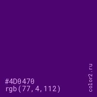 Цвет #4D0470 в цветовой модели RGB обозначается тремя октетами (77, 4, 112) в десятичном формате и #4D0470 в шестнадцатиричном (hex) формате, которые являются интенсивностью красного 77 (hex 4D), интенсивность зелёного 4 (hex 04) и интенсивность синего 112 (hex 70).