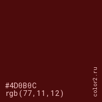 Цвет #4D0B0C в цветовой модели RGB обозначается тремя октетами (77, 11, 12) в десятичном формате и #4D0B0C в шестнадцатиричном (hex) формате, которые являются интенсивностью красного 77 (hex 4D), интенсивность зелёного 11 (hex 0B) и интенсивность синего 12 (hex 0C).