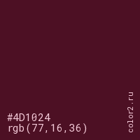 Цвет #4D1024 в цветовой модели RGB обозначается тремя октетами (77, 16, 36) в десятичном формате и #4D1024 в шестнадцатиричном (hex) формате, которые являются интенсивностью красного 77 (hex 4D), интенсивность зелёного 16 (hex 10) и интенсивность синего 36 (hex 24).