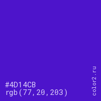 Цвет #4D14CB в цветовой модели RGB обозначается тремя октетами (77, 20, 203) в десятичном формате и #4D14CB в шестнадцатиричном (hex) формате, которые являются интенсивностью красного 77 (hex 4D), интенсивность зелёного 20 (hex 14) и интенсивность синего 203 (hex CB).