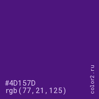 Цвет #4D157D в цветовой модели RGB обозначается тремя октетами (77, 21, 125) в десятичном формате и #4D157D в шестнадцатиричном (hex) формате, которые являются интенсивностью красного 77 (hex 4D), интенсивность зелёного 21 (hex 15) и интенсивность синего 125 (hex 7D).