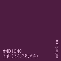 Цвет #4D1C40 в цветовой модели RGB обозначается тремя октетами (77, 28, 64) в десятичном формате и #4D1C40 в шестнадцатиричном (hex) формате, которые являются интенсивностью красного 77 (hex 4D), интенсивность зелёного 28 (hex 1C) и интенсивность синего 64 (hex 40).