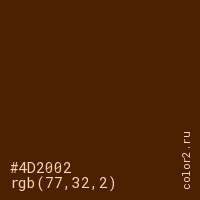 Цвет #4D2002 в цветовой модели RGB обозначается тремя октетами (77, 32, 2) в десятичном формате и #4D2002 в шестнадцатиричном (hex) формате, которые являются интенсивностью красного 77 (hex 4D), интенсивность зелёного 32 (hex 20) и интенсивность синего 2 (hex 02).