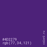 Цвет #4D2279 в цветовой модели RGB обозначается тремя октетами (77, 34, 121) в десятичном формате и #4D2279 в шестнадцатиричном (hex) формате, которые являются интенсивностью красного 77 (hex 4D), интенсивность зелёного 34 (hex 22) и интенсивность синего 121 (hex 79).