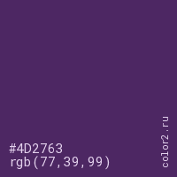 Цвет #4D2763 в цветовой модели RGB обозначается тремя октетами (77, 39, 99) в десятичном формате и #4D2763 в шестнадцатиричном (hex) формате, которые являются интенсивностью красного 77 (hex 4D), интенсивность зелёного 39 (hex 27) и интенсивность синего 99 (hex 63).