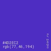 Цвет #4D2EC2 в цветовой модели RGB обозначается тремя октетами (77, 46, 194) в десятичном формате и #4D2EC2 в шестнадцатиричном (hex) формате, которые являются интенсивностью красного 77 (hex 4D), интенсивность зелёного 46 (hex 2E) и интенсивность синего 194 (hex C2).