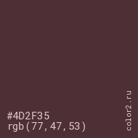 Цвет #4D2F35 в цветовой модели RGB обозначается тремя октетами (77, 47, 53) в десятичном формате и #4D2F35 в шестнадцатиричном (hex) формате, которые являются интенсивностью красного 77 (hex 4D), интенсивность зелёного 47 (hex 2F) и интенсивность синего 53 (hex 35).