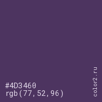 Цвет #4D3460 в цветовой модели RGB обозначается тремя октетами (77, 52, 96) в десятичном формате и #4D3460 в шестнадцатиричном (hex) формате, которые являются интенсивностью красного 77 (hex 4D), интенсивность зелёного 52 (hex 34) и интенсивность синего 96 (hex 60).