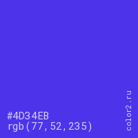 Цвет #4D34EB в цветовой модели RGB обозначается тремя октетами (77, 52, 235) в десятичном формате и #4D34EB в шестнадцатиричном (hex) формате, которые являются интенсивностью красного 77 (hex 4D), интенсивность зелёного 52 (hex 34) и интенсивность синего 235 (hex EB).
