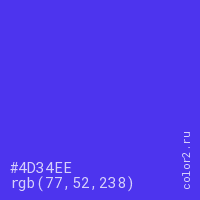 Цвет #4D34EE в цветовой модели RGB обозначается тремя октетами (77, 52, 238) в десятичном формате и #4D34EE в шестнадцатиричном (hex) формате, которые являются интенсивностью красного 77 (hex 4D), интенсивность зелёного 52 (hex 34) и интенсивность синего 238 (hex EE).