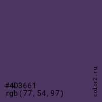 Цвет #4D3661 в цветовой модели RGB обозначается тремя октетами (77, 54, 97) в десятичном формате и #4D3661 в шестнадцатиричном (hex) формате, которые являются интенсивностью красного 77 (hex 4D), интенсивность зелёного 54 (hex 36) и интенсивность синего 97 (hex 61).