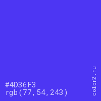 Цвет #4D36F3 в цветовой модели RGB обозначается тремя октетами (77, 54, 243) в десятичном формате и #4D36F3 в шестнадцатиричном (hex) формате, которые являются интенсивностью красного 77 (hex 4D), интенсивность зелёного 54 (hex 36) и интенсивность синего 243 (hex F3).