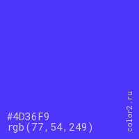 Цвет #4D36F9 в цветовой модели RGB обозначается тремя октетами (77, 54, 249) в десятичном формате и #4D36F9 в шестнадцатиричном (hex) формате, которые являются интенсивностью красного 77 (hex 4D), интенсивность зелёного 54 (hex 36) и интенсивность синего 249 (hex F9).