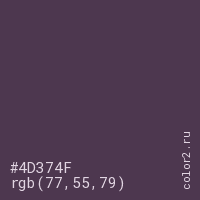Цвет #4D374F в цветовой модели RGB обозначается тремя октетами (77, 55, 79) в десятичном формате и #4D374F в шестнадцатиричном (hex) формате, которые являются интенсивностью красного 77 (hex 4D), интенсивность зелёного 55 (hex 37) и интенсивность синего 79 (hex 4F).