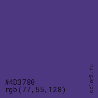 Цвет #4D3780 в цветовой модели RGB обозначается тремя октетами (77, 55, 128) в десятичном формате и #4D3780 в шестнадцатиричном (hex) формате, которые являются интенсивностью красного 77 (hex 4D), интенсивность зелёного 55 (hex 37) и интенсивность синего 128 (hex 80).
