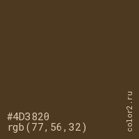Цвет #4D3820 в цветовой модели RGB обозначается тремя октетами (77, 56, 32) в десятичном формате и #4D3820 в шестнадцатиричном (hex) формате, которые являются интенсивностью красного 77 (hex 4D), интенсивность зелёного 56 (hex 38) и интенсивность синего 32 (hex 20).