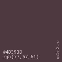 Цвет #4D393D в цветовой модели RGB обозначается тремя октетами (77, 57, 61) в десятичном формате и #4D393D в шестнадцатиричном (hex) формате, которые являются интенсивностью красного 77 (hex 4D), интенсивность зелёного 57 (hex 39) и интенсивность синего 61 (hex 3D).