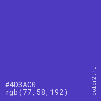 Цвет #4D3AC0 в цветовой модели RGB обозначается тремя октетами (77, 58, 192) в десятичном формате и #4D3AC0 в шестнадцатиричном (hex) формате, которые являются интенсивностью красного 77 (hex 4D), интенсивность зелёного 58 (hex 3A) и интенсивность синего 192 (hex C0).