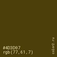 Цвет #4D3D07 в цветовой модели RGB обозначается тремя октетами (77, 61, 7) в десятичном формате и #4D3D07 в шестнадцатиричном (hex) формате, которые являются интенсивностью красного 77 (hex 4D), интенсивность зелёного 61 (hex 3D) и интенсивность синего 7 (hex 07).